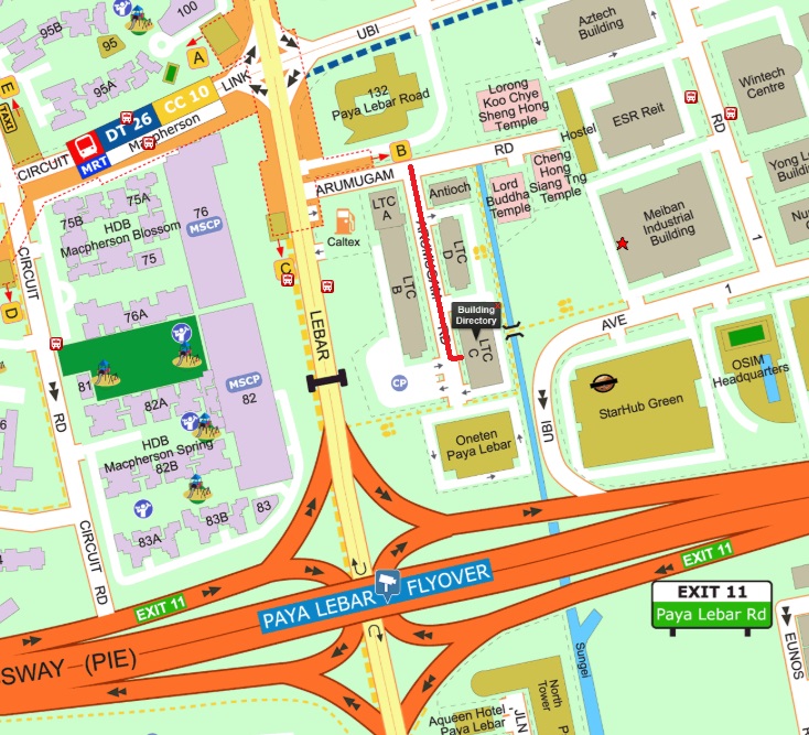 B – Exit via B (1 min walk/100 steps to LTC Building C)